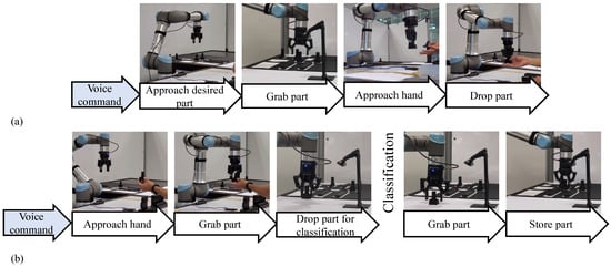 For testing the integrated system, a total of 560 routines were performed by 16 individuals. Each person had to construct the assembly twice by performing a complete “bring part” and “take part” routine. Figure 10a exemplifies the “bring part” routine, and Figure 10b exemplifies the take part routine for object number 5. These tests were conducted in a closed and dedicated room to minimize external noise. During the tests, the individual carrying them out stood in front of the table designated for human–robot interaction, positioned in front of the Intel® depth camera, and 25 cm away from the microphone. To evaluate these tests, all the results and errors obtained with the system were recorded. For a test to be considered successful, it had to fulfill the following criteria: correct voice command recognition, accurate hand tracking (distance to MCP under the 50 mm threshold), correct object classification, execution of adequate UR5e routines, and real-time inventory updates for each part in both systems.