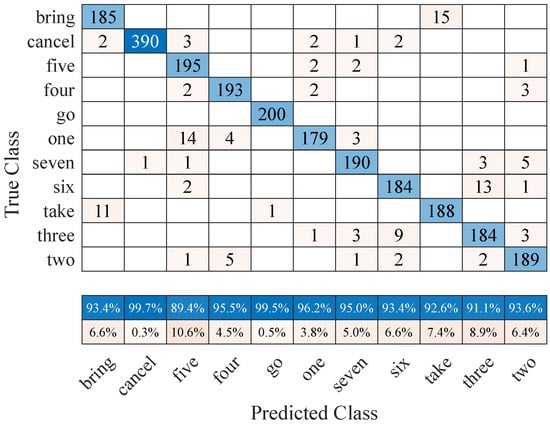 Misclassification of voice commands may lead to the execution of incorrect routines. However, the “cancel” command serves to halt misidentified routines, as depicted in Figure 4. Moreover, our tests revealed that the “cancel” command demonstrated a prediction accuracy of 99.7%, as observed in Figure 12. For safety measures, an emergency stop button is available for immediate use when necessary.