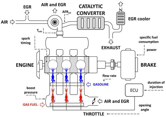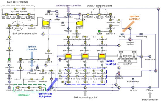 Figure 1 shows an overall layout of the power unit, with highlighted components and gas flow paths, including EGR. Table 1 shows its main specifications. The gas injectors are shown to be located upstream in the intake runners (only for illustration purposes), but the actual location in the simulations was considered close to the intake port.