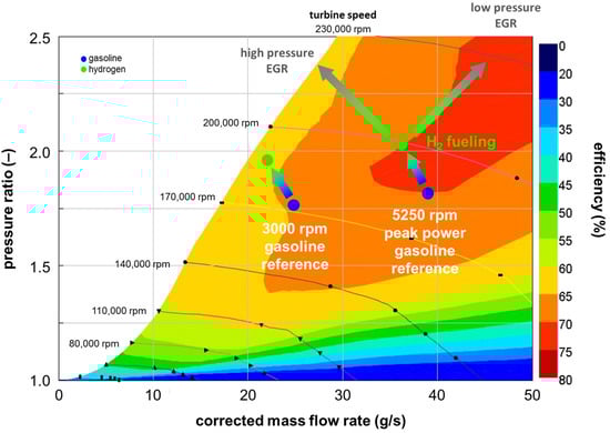The starting point for the analysis was to evaluate the two EGR configurations, i.e., low- and high-pressure circuits. Figure 3 shows the full-load operating points at 3000 rpm and peak power (i.e., 5250 rpm) in the compressor map domain; more to the point, it illustrates how the compressor rpm–pressure ratio points shifted from the situation with gasoline fueling (dark blue points) to hydrogen without EGR (light green points) and then at the end of the longer arrows when operating with H2 at the maximum achievable recirculation level.