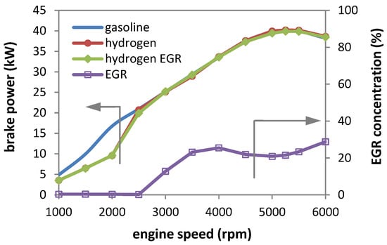 Full-load power curve with gasoline, hydrogen, and maximum achievable EGR.