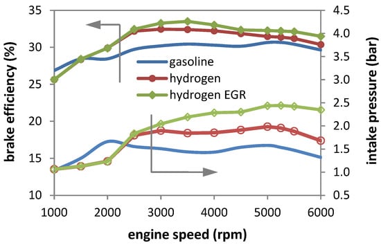 Applying EGR ensured a further slight improvement in efficiency, especially in the mid-rpm and peak power region. Evidently, increased boost levels would be needed with an intake pressure of around 30% higher when switching from gasoline to H2 and of close to 60% when applying EGR. Such elevated manifold pressure (absolute values of close to 2.5 bar) is not uncommon in state-of-the-art automotive SI engines but would be a point to consider when evaluating the conversion of an existing power unit. More to the point, even if the turbine–compressor assembly were capable of operating in the region predicted to ensure the intended boost pressure for EGR, control limitations may prevent actual implementation. Therefore, the control system may require additional hardware modifications (e.g., the pneumatic actuator that controls the wastegate) and not just ECU remapping. The actual relative gain in efficiency of up to 3% compared to non-diluted operation is, however, another important positive aspect, especially as it can be achieved in the high-load region, i.e., most likely to be used during highway driving and therefore with a significant impact on vehicle range.