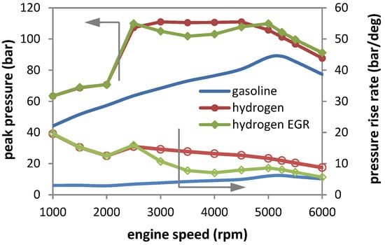 Another essential influence of using H2 is that its high laminar flame speed results in increased peak pressure, as well as a higher pressure rise rate. Indeed, much higher values were predicted throughout the engine speed range, especially at low rpm (Figure 6; please note that only the results for cylinder #1 are shown). The maximum difference was recorded at 2500 rpm, for which peak pressure was almost double for H2 compared to gasoline. This can be explained by the fact that, at low rpm, the laminar flame speed exerted a more significant influence on combustion development, and therefore, the difference between the two fuel types was much more evident. This effect would be even more prominent at a lower crankshaft speed, but the lack of boost in that operating region resulted in lower in-cylinder pressure during the cycle. When looking at the relative difference between H2 and the H2 EGR case, it is evident that peak pressure was completely comparable throughout the range; this can be seen as a positive aspect, meaning that even if higher boosting is required when recirculating the exhaust gas, the actual stress on the cranktrain is not augmented significantly. There would still be an increase with respect to the reference level with gasoline, but overall, it could be acceptable. The maximum pressure rise rate (PRR) was instead predicted to be significantly different when using EGR. Recirculation almost lowered this parameter to levels comparable to those recorded for gasoline operation and close to the 6–7 bar/deg range usually recommended as acceptable in terms of combustion noise []. Instead, at a low rpm, the PRRmax figure was predicted to be well over this threshold and even over levels usually encountered during HCCI operation. Nonetheless, one of the main conclusions is that EGR has the potential to significantly reduce full-load pressure rise rates while ensuring benefits in terms of efficiency; the only shortcoming is that it requires higher boost levels so as to render possible the augmented flow through the engine.