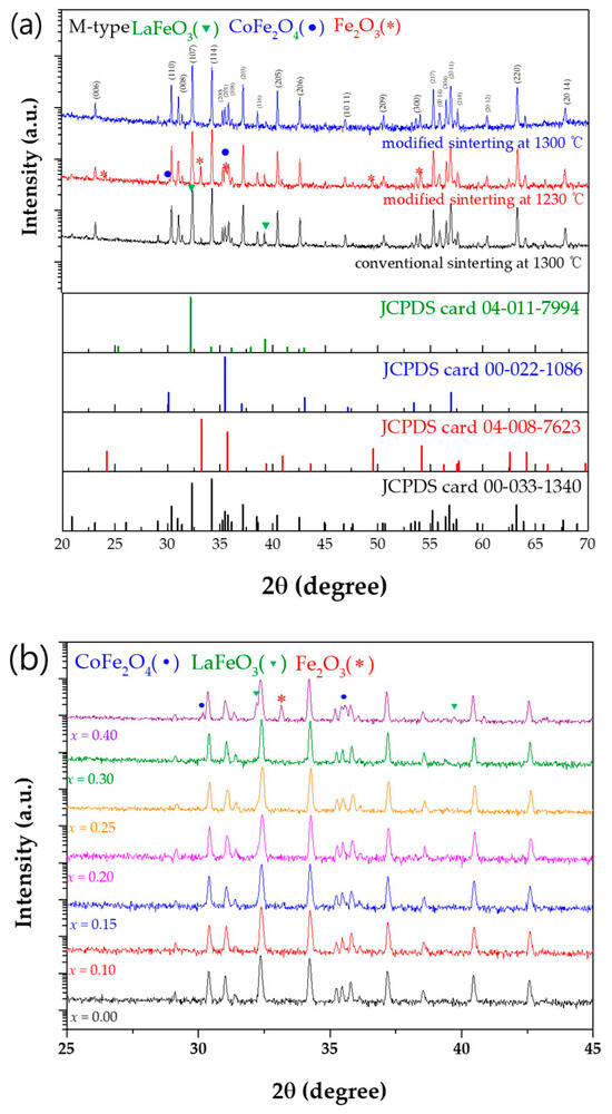 The powder XRD patterns of samples with x = 0.3 in Sr1−xLaxFe12−xCoxO19 as a representative of all samples are shown in (a), where bottom pattern is from the conventional process (calcination at 1280 °C for 2 h, sintering at 1300 °C for 2 h), middle pattern from our modified process (calcination at 1280 °C for 2 h, sintering at 1230 °C for 2 h), and top pattern from our modified process (calcination at 1280 °C for 2 h, sintering at 1300 °C for 2 h). Powder XRD patterns from our modified process (calcination at 1280 °C for 2 h, sintering at 1300 °C for 2 h) for the samples with x = 0, 0.1, 0.15, 0.2, 0.25, 0.3, and with x = 0.4 (b).