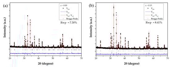 To calculate the lattice parameters a and c, Rietveld refinement was performed with Rwp (weighted profile R-value) less than 9% and χ2 (reduced Chi-squared value) less than 1.4 accuracy. The Rietveld analysis data are shown in Figure 2a,b for x = 0.0 and 0.3, respectively, as representatives of all samples. From the powder XRD patterns in Figure 1b, the lattice parameters a and c of the samples were calculated using the following equation [19],