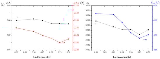 The lattice parameters (a, c) (a), unit cell volumes (Vcell) and the c/a ratios (b) for the Sr1−xLaxFe12−xCoxO19 (0 ≤ x ≤ 0.3) samples sintered at 1300 °C for 2 h in air.