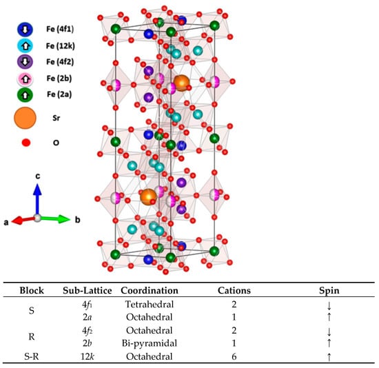 To understand the above peculiar variations of a and c with x, it is necessary to consider, in addition to the size difference, the effect of the valence difference on the lattice parameters, since the valence of the substituents (La3+, Co2+) is different from that of the original cation sites (Sr2+, Fe3+). To describe the cation sites within the unit cell of SrM hexaferrite, their locations must be specified as shown in Figure 4. The M-type hexaferrites exhibit a hexagonal structure composed of alternating layers of spinel (S, Fe6O8) and hexagonal (R, MFe6O11) blocks arranged as SRS*R*, where the asterisk (*) indicates a 180° rotation around the c-axis. The crystallographic sublattices of Fe3+ within the M-type structure are further divided into five distinct sites: 2a, 2b, 4f1, 4f2, and 12k sites. The magnetic moments of Fe3+ ions at the 12k, 2a, and 2b sites are oriented parallel to the c-axis (up-spin), while those at the 4f1 and 4f2 sites are oriented antiparallel (down-spin) [31].