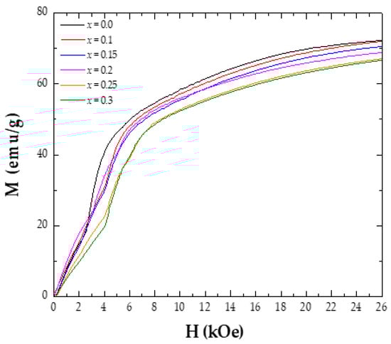 The magnetic hysteresis loops of samples are shown in Figure 8. From these loops, the maximum M values measured at H = 26 kOe (M@26kOe) and intrinsic coercivity (Hci) were obtainable. These values are also listed in Table 2. The MS, M@26kOe, Ha, and Hci values for all samples in this table are plotted as a function of x as shown in Figure 9.