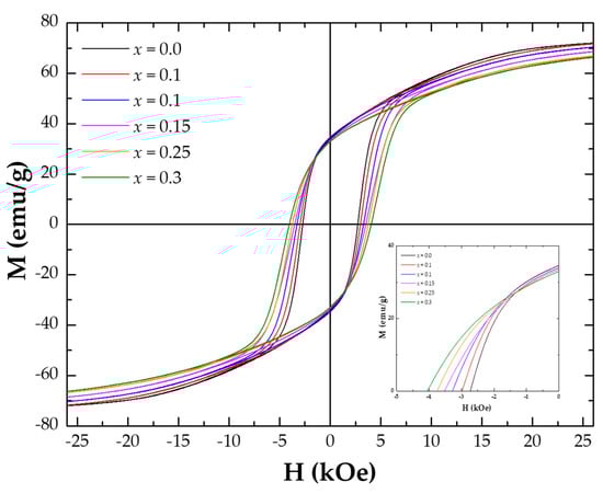 The effect of La-Co substitution (x) on the magnetic properties of as-sintered samples can be understood as follows. As shown in Table 2 and Figure 9a, the values of MS and M@2.6kOe gradually decrease from 75.90 to 72.07 emu/g and from 72.27 to 66.80 emu/g, respectively, as x increases from 0.0 to 0.3. This suggests that Co2+ replaces Fe3+ at the 4f2 site, while Co2+/Fe2+ substitution occurs at the 2a site, leading to the gradual decrease in MS. The MS dependency of x for our samples agrees well with that reported for powder samples prepared by the sol–gel process and subsequent firing at 900 °C for 24 h in air [20]. Specifically, MS decreases as x increases. However, the MS vs. x behavior reported by T. T. Loan et al. [23] differs from ours, despite their use of the sol–gel process and subsequent firing at 900 °C for 2 h in air to prepare powder samples with x = 0.0 and 0.05. Lower MS values for samples with x = 0.0 and 0.05 may be due to the presence of small nanoparticles (<50 nm) exhibiting superparamagnetism, as observed in their SEM micrographs. In contrast, the larger particles in samples with x ≥ 0.1 exhibit a decreasing behavior in MS with increasing x, similar to our sintered bulk samples.