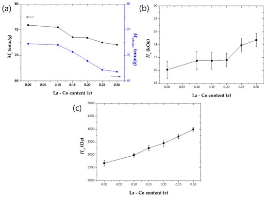 Figure 3a shows the variation in the lattice parameters a and c with increasing x. Initially, a increases from x = 0.0 to 0.1 but then decreases up to x = 0.20; it then remains almost unaltered up to x = 0.3 while the lattice parameter c monotonously decreases with increasing x from 0.0 to 0.25, but it turns to an increase from x = 0.25 to 0.3. Since La3+ and Co2+ ions have been reported to replace the Sr2+ and Fe3+ sites, respectively [22,29], we sought to understand these behaviors by the smaller La3+ (1.22 Å) replacing the larger Sr2+ (1.31 Å) based on nine oxygen ion coordination and the larger Co2+ (0.75 Å) replacing the smaller Fe3+ (0.65 Å) based on six oxygen ion coordination [30]. As the same amount of La3+ was used to substitute for Sr2+ and Co2+ for Fe3+, all samples were composed of the M-type single phase without any second phase, as shown in Figure 1b. Therefore, it is reasonable to assume that charge neutrality is always maintained. Considering only the influence of the size difference between the substituents (La3+ and Co2+) and the original cation sites (Sr2+ and Fe3+), the lattice constants a and c are expected to change consistently as a function of x. This consistency of the variations in a and c with x is observed for a wide range of x values, including the monotonous decrease in c up to x = 0.25 and the gradual decrease in a from x = 0.1 to 0.2, followed by almost constant values up to 0.25. The changes are surely due to the decreasing size effect of La3+ substitution for Sr2+, which exceeds the increasing size effect of Co2+ for Fe3+. However, in a limited range of x values, the variations in a and c with x, including the increase in c from x = 0.25 to 0.3 and also for the increase in a from x = 0.0 to 0.1, are unexplainable only with the size difference between the substituents (La3+, Co2+) and the original cation sites (Sr2+, Fe3+).