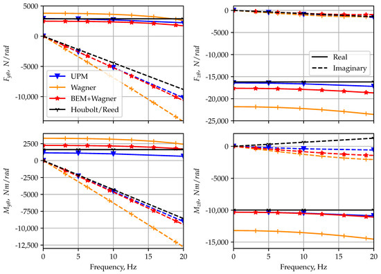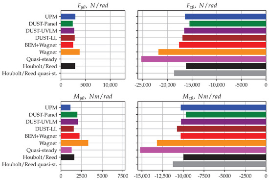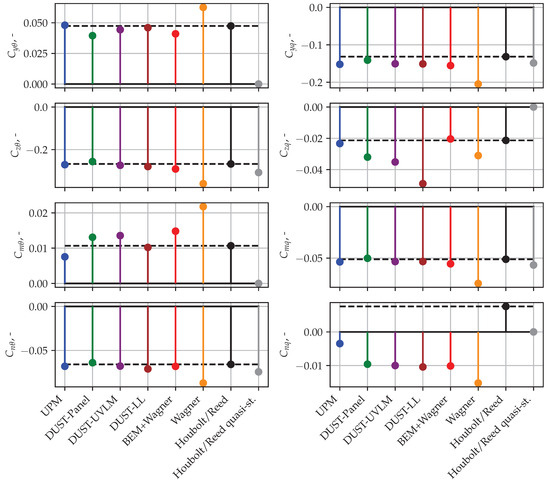 Figure 10 shows a comparison of the eight unique derivatives obtained from the frequency-dependent transfer functions with the derivatives from the Houbolt/Reed method (marked with horizontal dashed lines in each plot). In general, good agreement is found among most methods for derivatives , , and . These (similar to the 1P hub loads) are the in-phase components, which are mainly related to kinematics [11]. The Wagner method has the highest deviations from the Houbolt/Reed method and the mid-fidelity codes. The BEM+Wagner method matches again very well with the mid-fidelity methods. Larger differences among the predictions can be observed for the other components (, , and ), which are the off-axis terms mainly influenced by the unsteady aerodynamic method. Special attention should be paid to the bottom right plot, for the yaw moment due to pitch velocity (). Here, all time-domain methods predict a different sign for aerodynamic damping compared with the Houbolt/Reed method. The reason could not yet be clarified by the authors. This derivative is often set to 0 in the literature [9], as it is very small compared with the others and does not impact the stability results (see the small sensitivity in Figure 2).