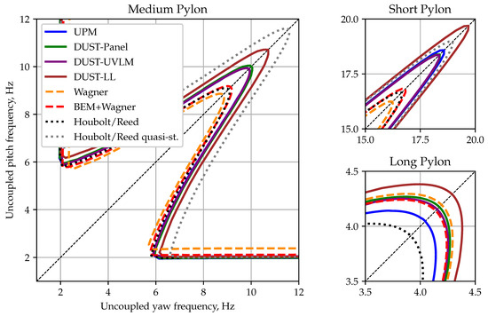 Figure A3 shows the resulting stability maps for the thrusting and non-thrusting conditions. As it can be clearly seen from the figure, thrust and torque have a (strong) stabilizing effect on whirl flutter stability, as already known from the literature [1]. In fact, it is not the thrust vector itself that leads to this stabilization. The steady-thrust effects on the transfer functions (aerodynamic stiffness in and ) cancel each other out for the simplified pylon system, which only shows rigid-body rotations. The thrust vector always points through the pivot point and thus cannot contribute to the generalized loads. The reason for the stabilization can mostly be attributed to the tilting torque vector decreasing the destabilizing coupling torque ().