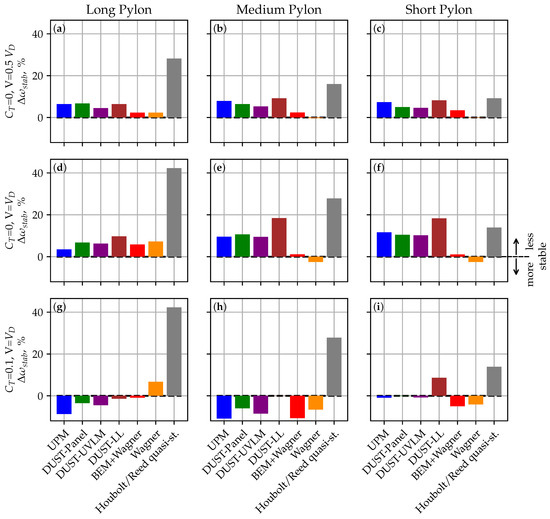 Figure A5 presents the performance of the three BEM methods with regard to whirl flutter stability in a plot similar to Figure 12. Despite predicting the aerodynamic loads better than the two other BEM formulations, the BEM+Wagner results are not always closer to the mid-fidelity reference (see middle row in Figure A5). On the other hand, the AMT (like the Wagner method without inflow) for some configurations (e.g., mid and short pylons) gives an even more stable system than Houbolt/Reed, and the DMT shows higher sensitivity to the system parameters compared with the reference (see dark-blue bars in the middle row).