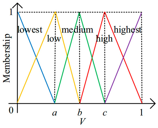 As shown in Figure 4, the first layer of the two-layer FRS includes an independent FS, taking and as inputs. The output of the first layer, combined with , serves as the input for the second-layer FS, allowing further inference. The output of the second-layer FS represents the reward value integrating all three input factors. Within this two-layer FRS, the total number of rules in the system is reduced to 50. The aforementioned parameters are normalized within the range (0, 1) and input into the system. Triangular MFs, as per Equation (5), are used for fuzzification, transforming each parameter into five fuzzy values: VG, G, M, B, and VB.
