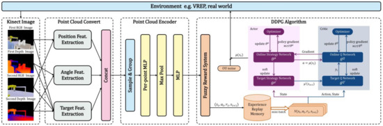 Current research in DRL predominantly focuses on methods based on value functions, such as deep q-learning (DQN) and its variants, as well as on methods founded on policy gradients, like the policy gradient (PG) algorithm. However, these methodologies often encounter challenges when they are applied to continuous action spaces, particularly in terms of learning efficiency and path-planning effectiveness in sparse reward environments. For instance, Sangiovanni B et al. employed the DQN-NAF algorithm to control an industrial robotic arm model within the V-REP virtual environment [9]. By crafting a well-structured dense reward function, they successfully enabled the robotic arm to perform tasks effectively while avoiding obstacles in the environment. Similarly, Mahmood A R and colleagues utilized the trust region policy optimization (TRPO) algorithm to adeptly control a UR5 robotic arm to reach target points [10]. Their research emphasized the challenges and issues encountered when applying reinforcement learning algorithms to the control of real robotic arms. Wen S and others delved deeper into the application of the deep deterministic policy gradient (DDPG) algorithm for robotic arm motion planning [11]. They not only examined motion planning in environments with and without obstacles but also proposed improvements to the DDPG algorithm, incorporating transfer learning [12] to accelerate the algorithm’s convergence rate. In a notable advancement, Xu Jing et al. developed a model-driven DDPG algorithm [13] that replaced explicit reward functions with a fuzzy system (FS), enabling the successful accomplishment of pin insertion tasks using a six-degree-of-freedom robotic arm. In this study, the states in the DRL algorithm included observations of interactive forces and momentum during task execution, and a corresponding fuzzy reward system (FRS) was designed to achieve continuous control over the action space. This method was validated in both simulation and real-world tests, achieving a 100% success rate.