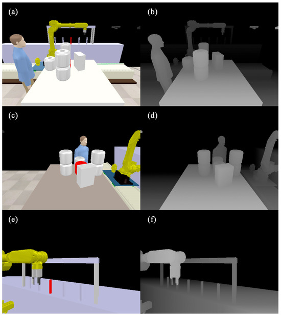 RGB-D images captured using Kinect in the simulation environment; (a,c,e) are RGB images and (b,d,f) are grayscale maps representing depths.