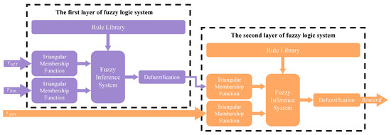 In the domain of reinforcement learning, environmental feedback manifests as reward signals, indicating the efficacy of an agent’s actions in specific states. To optimize learning efficiency, it is imperative for the reward function to be defined with clarity and precision, incorporating parameters that directly influence the agent’s decision-making process and the dynamics of their interactions [24]. The accuracy of the reward function is crucial, as it significantly influences the computational complexity required. Furthermore, multi-criteria decision making in this context often demands a flexible approach to defining optimality [25]. Central to this discussion is the FRS, a computational construct grounded in fuzzy logic for robust information processing and decision making. This system comprises four integral elements: a fuzzifier, a knowledge base (encompassing rule bases or databases), a fuzzy inference engine, and a defuzzifier [26]. Among FS, the two prevalent types are Mamdani-type FS [27] and Sugeno-type FS [28], distinguished by their methodologies in deriving precise outputs from fuzzy inputs—Mamdani through defuzzification and Sugeno via weighted averages.