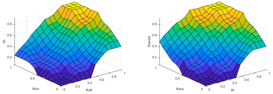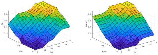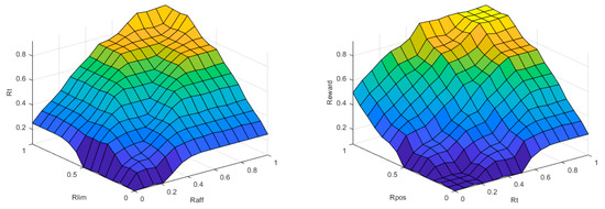 During the mid-course obstacle-avoidance phase, the focus of the fuzzy reward rule base shifts to safety and energy efficiency. The rules may become more complex, considering multiple sensor inputs and the dynamic state of the robotic arm. A principal rule is “If the robotic arm maintains a safe distance from the nearest obstacle and consumes lower energy, then the reward is high”. The detailed rules are presented in Table 3, with the fuzzy logic system’s output shown in Figure 6.
