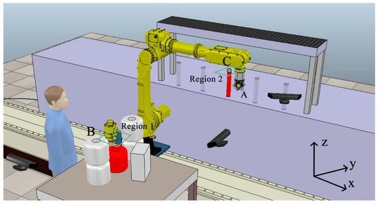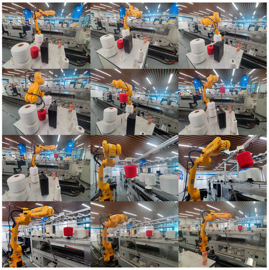 The process of grasping and placing the yarn spool involves a series of precise actions. Firstly, the robotic arm’s end effector must vertically descend, insert its claws into the central hollow of the spool, expand them, and then lift the spool using frictional force, eventually placing it at point C on the left platform with appropriate posture. To increase the generalizability of the problem, only one target spool is placed in the virtual twin platform (directly below Region 1), but its position may vary in different simulations to accommodate diverse possibilities.
