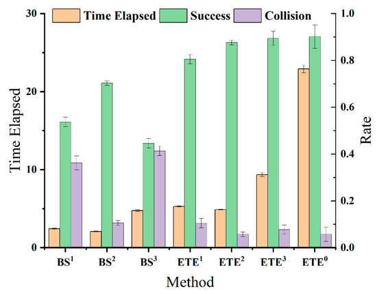 As shown in Figure 9, within the same algorithm, trajectory 2 required less time, and exhibited better success and collision rates compared to the other two trajectories, indicating its relative simplicity. This finding was corroborated by the description in Section 4. Notably, the time consumption for BS0 in the table is the sum of the time taken for the three baseline segments, with the success rate and collision rate being the average of these three baseline performances. In test scenarios, our end-to-end DRL model achieved a success rate of 90.1% and a collision rate of only 5.7%. Despite a slight increase in training time, the end-to-end DDPG showed significant advantages in terms of task success rate and collision reduction compared to the baseline model. This can be attributed to the deep network’s precise mapping of state–action relationships and efficient execution of more complex tasks. Next, we will comprehensively assess the adaptability of the algorithm model to environmental changes in complex environments.