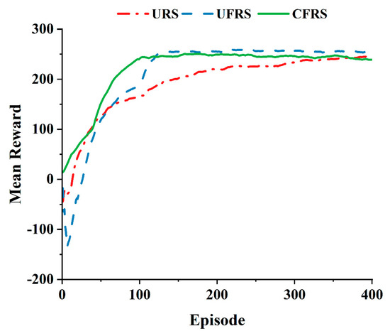 Data from Figure 10 reveals that models employing URS converge more slowly, achieving convergence around 250 k episodes, indicating limitations in global optimization. In contrast, UFRS models converge within approximately 120 k episodes, demonstrating faster optimization speeds. Most notably, CFRS models converge within just 100 k episodes, illustrating the effectiveness of cascaded fuzzy rewards in efficient signal propagation and rapid global optimization.