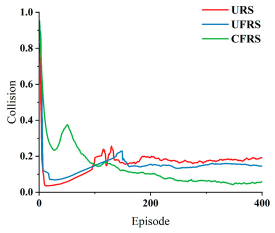 Figure 11 focuses on the trends in collision rates under different reward systems. The URS model initially experiences a rapid decrease in collision rates but later stabilizes around 20%, possibly due to settling at local optima induced by its simplistic reward mechanism. UFRS shows a significant initial decrease in collision rates, with fluctuations within the 15–20% range, indicating some robustness in dynamic environments. CFRS, on the other hand, exhibits a continual decrease in collision rates, eventually stabilizing at a low level of around 5%, further proving its robustness and efficiency in practical operations.