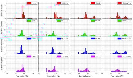 The graphs in Figure 1 show the averages of three porosity distributions for each sample during aging (the first three rows at 3, 14, and 28 days, respectively) and after a 200 °C thermal treatment of samples aged for 28 days. After the thermal treatment, all the samples exhibited significant weight loss [23,24] due to water evaporation, as detailed in Table 3.