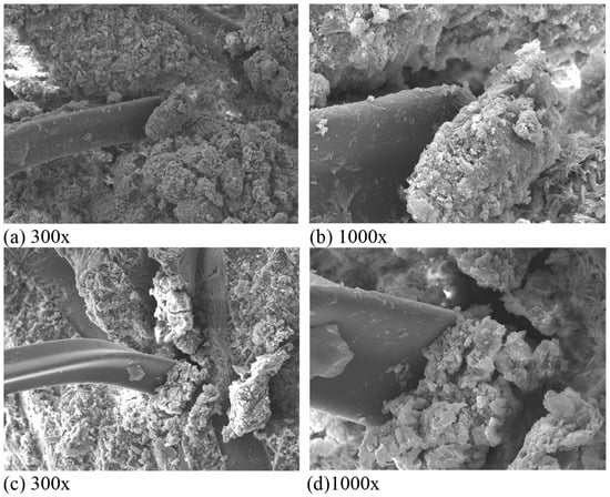 The samples without SA-PA and CS fibers (Figure 4 and Figure 5, respectively) appeared well crystallized. SA-PA absorbed water during mixing, but released it slowly during the hydration of the cement phase, which was continuous and homogeneous, without the formation of large empty cavities.