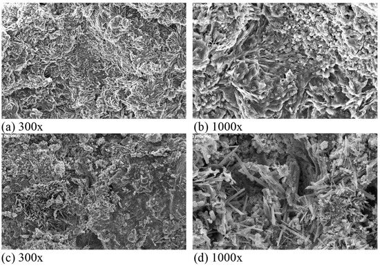 SEM micrographs of 3-day-aged (a,b) and 28-day-aged (c,d) NY samples.