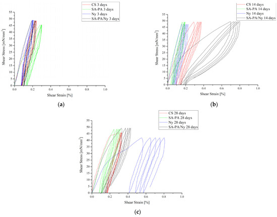 Loading–unloading shear stress–shear strain (%) curves at different curing times: 3 days (a), 14 days (b), and 28 days (c).