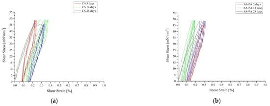 After 14 days of aging, the deformability of all the samples increased. SA-PA/Ny not only showed an increase in permanent strain with each loading and unloading cycle, but also exhibited an increasing maximum strain: every time the sample was unloaded, the next cycle moved to higher maximum deformation, even if the sample regained almost the first permanent deformation. In Figure 6b, the unloading and the reloading paths of the SA-PA/Ny sample are significantly different, exhibiting large hysteresis loops. The curves of the 14-day-aged samples showed an inflection point on unloading. This could be an indicator of crack development in the material [42]. Degradation of the concrete was reflected in the decrease in the slopes of the reloading curves. Reloading curves were nearly linear, up to the beginning of the unloading curve, after which softening could be observed. The unloading curve softened gradually while the stress decreased and the stiffness of the unloading curve became smaller.