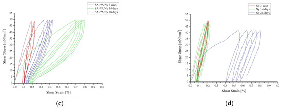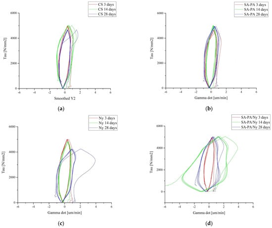 Shear stress–shear strain rate curves of CS (a), SA-PA (b), Ny (c), and Ny/SA-PA (d) after 3, 14, and 28 days of curing.