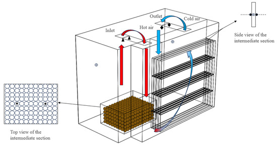 The temperature-controlled container with a cold energy storage system developed by South China Agricultural University (Guangzhou, China) is shown in Figure 1, and the specific dimensions of the container are shown in Table 1. The container is mainly composed of a cold storage area, fresh-keeping area, circulating duct, and fan. The construction material of the container is mainly glass fiber reinforced plastic (GFRP). The insulation layer consists of vacuum insulation board (VIP) and polyurethane (PU), and the properties of the materials are shown in Table 2. The airflow in the container is driven by the fans (0.13 m × 0.13 m, DC, 24 V, 0.7 A), and for the adjustment of the control system, the airflow speed when the fan is activated is standardized to 4.4 m/s. Due to the airflow circuit between the cold storage area and the freshness preservation area, the cold energy released from the PCM is continuously transported to the fresh-keeping area in order to maintain a low-temperature environment of 2–8 °C.