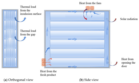 In the formula, Q3 is the thermal load from the gap leakage, W; f is the air leakage coefficient of the container and can be between 0.1 and 0.2 based on the airtightness of the container [28], 0.1; Q4 is the thermal load for solar radiation, W; A3 is the area exposed to solar radiation (generally, between 30% and 50% of the total area is chosen; we chose 50%), m2; Tr is the temperature of the surface exposed to solar radiation (Tr = Tw + 20), ℃; τf is the time of solar radiation per day and night, h; Q5 is the heat from the fan operation, W; p is the rated power of the fan, W; ψ is the coefficient of thermal conversion, 1; and ε is the coefficient of fan operation time [29], 19 h.
