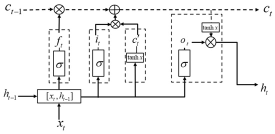 A typical LSTM cell is shown in Figure 6, where and denote multiplication and addition, respectively, by bits, xt is the input parameter at moment t, ct is the output parameter from the memory cell at moment t, ht is the output parameter of the control cell at moment t, ct−1 is the memorized information of the previous moment, ft is the probability that ct− is forgotten, it is the probability that the candidate valuegenerated from the activation function tanh xenters the memory cell, is the memory candidate value after the current data were transformed, and ot is the probability that the current data become the output data. The output parameter ht is not only related to the input xt but also to the previously remembered information ct−1, and the new input xt will also prompt the memory cells to generate updates that are carried forward [20]. The output of the implicit layer is mapped using the function of the output layer to obtain the predicted value of the temperature.