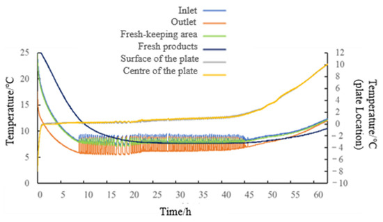 The average outdoor ambient temperature during the test was 24.5 °C. The temperature variation with time at each monitoring point is shown in Figure 7. The test was conducted for 62.95 h. At the beginning, due to the large temperature difference between the initial ambient environment and the cold storage plate, the temperature of the inlet, outlet, fresh-keeping area, and fresh products dropped rapidly under the work of the cold storage system, and it took 12.51 h for the navel oranges to be cooled down from the initial temperature to the target temperature of 10 °C. This also means that the fresh product was maintained at a lower temperature for the majority of the experiment. The temperature-controlled interval of the outlet temperature (5~10 °C) lasted 50.44 h. The average temperature of the fresh-keeping area within the temperature-controlled interval was 8.5 °C, and the average temperature of the products was 8.3 °C, which suggests that the retention and release rates of cold energy from the PCM allowed the temperature of the holding area to be maintained in a suitable range for a long period. The center temperature of the cold storage plates was maintained near the theoretical temperature of 0 °C (−2~2 °C interval) for 46.07 h, which accounted for 73.2% of the total test duration, reflecting the fact that the cold energy is mainly stored as the latent heat of the phase change material [37]. After 46.07 h, the temperature at the center of the plate rose faster because the PCM had ended the phase transition process, and the value of the difference between its temperature and the ambient temperature was greater than 8 °C, which formed a higher heat transfer rate. The temperature curves of the other monitoring points changed smoothly because the temperature difference between them and the environment was relatively small, and there was not a high rate of heat exchange. The fan was activated 88 times (9.06–45.71 h) during the test. The slight discrepancy observed between the center and surface temperatures of the cold storage plates during the test could be attributed to the uniform temperature distribution of the phase change material (PCM) during the phase transition, resulting in a surface temperature measurement that closely approximates the center temperature.