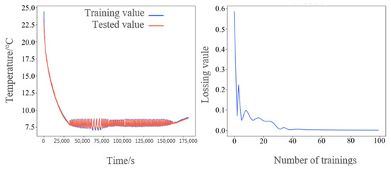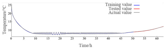 On the basis of the historical temperature data, the LSTM was used to predict the temperature inside the temperature-controlled container with a cold energy storage system. Initially, 62.95 h (226,604 s) was used as the sample for the dataset, the initial 80% of the dataset was used as the training set for training and model optimization, and the spare 20% of the data were used as the test set to evaluate the generalization and prediction accuracy of the LSTM model; the normalization process was carried out before inputting the data into the model to achieve a better prediction by continuously fine-tuning the parameters and decreasing the error [33].