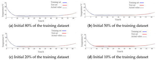To maintain the model’s predictive accuracy while enhancing its practicality, the number and structure of the inputs and outputs were optimized. This not only allows for more precise future predictions of the CCB but also reduces the model’s training time and improves its generalizability [38]. The initial 80%, 50%, 20%, and 10% of the samples were configured as training sets, and the corresponding training and prediction results are shown in Figure 11 and Table 5. It can be seen that the accuracy of the prediction results of the different methods with the training set of the initial 80%, 50%, and 20% are similar, indicating that there is no need to have a training set consisting of too many samples if the characteristics of the time series are regular. The training time of the model decreases significantly with a reduction in samples in the training set, but the prediction accuracy, R2, decreases significantly only when the number of samples in the training set is the initial 10%. Using the initial 20% of the historical temperature data to predict the future 80% of the temperature data is the most practical approach; the training time and R2 are 932 s (15.5 min) and 0.997, respectively.