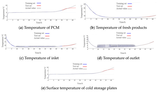 The training set of the model was set to the initial 80% of the samples, and the value of the CCB temperature of the PCM and fresh products was set to 5 °C and 10 °C, respectively. The training and prediction results are shown in Figure 12a–e and Table 6. As shown in Figure 12, the predicted temperature variations are all in agreement with the actual values. As shown in Table 6, the relative errors in predicting the status of CCB in cold energy storage sources and fresh products are 1.05% and 0.45%, respectively, indicating that the LSTM model can accurately predict the status of CCB. In addition, the RMSE and MAE of the temperatures of the fresh products, inlet, outlet, and surface of cold storage plates are all below 1.000, the MAPE is below 0.1000, and the R2 of the temperatures of the fresh products, inlet, and outlet are slightly higher, with values exceeding 0.9400, which indicates that the LSTM model accurately predicts the temperatures of the fresh products, inlet, outlet, and the surface of cold storage plates.