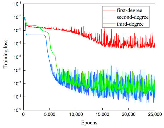 For each simulation case, 25,000 epochs are performed in the training of the PINN model to guarantee convergence. The loss function histories versus epochs at different degree values are given in Figure 2. It can be seen that the training converged after around 15,000 epochs.
