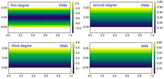 According to Equation (23), three hard constraints with different degrees (i.e., = 1.0, 2.0 and 3.0) and the same scaling factor (i.e., = 1.0) are generated to examine the effect of degree on the prediction accuracy of PINN for the plate shear flow.