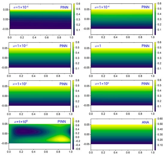 Seven hard constraints with different magnitudes of (i.e., = 1.0 × 10−6, 1.0 × 10−4, 1.0 × 10−2, 1.0, 1.0 × 102, 1.0 × 104 and 1.0 × 106) and the same degree (i.e., = 2.0) are formulated to examine the effect of scaling factor on the PINN prediction accuracy.
