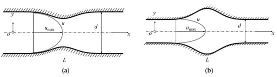 Stenotic flow and aneurysmal flow: (a) stenotic flow; (b) aneurysmal flow. Here, is the channel length, is the distance between the channel walls, is the local streamwise velocity and is the velocity at the center line.