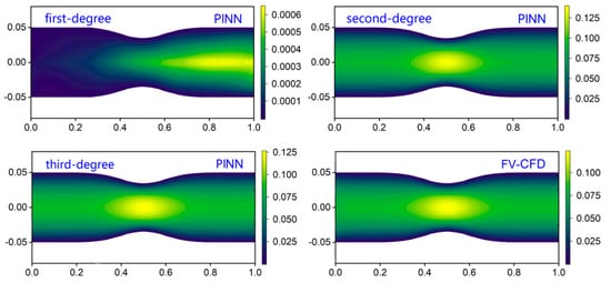 In Figure 7 and Figure 8, the distributions of axial velocity for stenotic/aneurysmal flow are further compared between PINN and FV-based CFD. For the sake of saving space, only the results of stenotic flow with A of 4.0 × 10−3 and aneurysmal flow with A of −2.2 × 10−2 are provided. There are significant deviations between PINN-predicted results with first-degree hard constraints and FV-based CFD results, while the predicted axial velocity distributions by PINNs with second- and third-degree hard constraints exhibit good agreements with the FV-based CFD results, corresponding to the errors shown in Table 5.