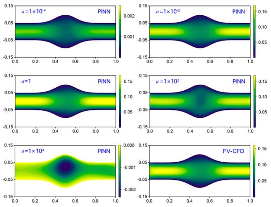 where is the inlet diameter before vasoconstriction or dilation, which is fixed to be 0.05; and define the shape of vasoconstriction/dilation and equal 0.5 and 0.1, respectively; is a constant that determines the degree of vasoconstriction/dilation. A positive value of corresponds to the stenotic flow while a negative value corresponds to the aneurysm flow, and a greater absolute value of A indicates a higher degree of expansion/contraction of the flow channel. In the following test, PINN-predicted results for different geometries of the flow channel (i.e., = 4.0 × 10−3, 7.0 × 10−3, − 1.2 × 10−2 and − 2.2 × 10−2) are examined while the inlet and outlet pressure are set to be 0.1 and 0, respectively, and the viscosity is 1.0 × 10−3. Since there is no analytic solution for the investigated stenotic/aneurysmal flow, CFD simulations based on the conventional FV method are performed to provide a benchmark for the PINN-predicted results. The commercial flow solver ANSYS-Fluent is employed to conduct the FV-based CFD simulations. The second-order upwind scheme and second-order central scheme are adopted for the discretization of convection and diffusion terms, respectively, and the SIMPLE (semi-implicit method for pressure linked equations) algorithm is utilized for pressure–velocity coupling. As the Reynolds number is low and the flow is completely laminar, no turbulence model is employed in the computations. A structured computational grid with 20 × 100 cells in streamwise and vertical directions is used in the FV-based CFD simulations.