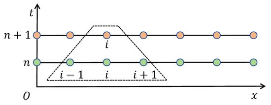 Template for explicit finite differences. The state of node i is affected by neighboring nodes.