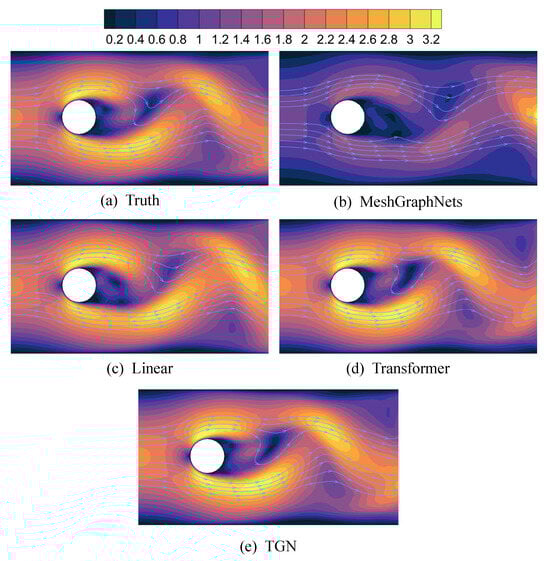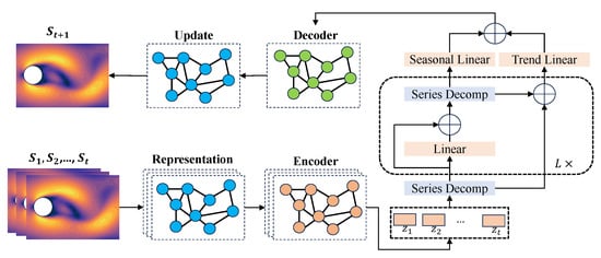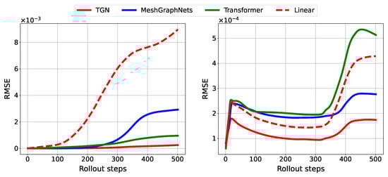 On the other hand, some current autoregressive prediction models have achieved great success in LTSF tasks, such as Recurrent Neural Networks (RNNs) [11], Transformer [12,13,14,15,16,17], or simple linear models [18]. They can capture trending and periodic information from historical time series. For example, cylinder flows show periodic changes during the vortex shedding phase; their system states also trend over time, and the next system state is influenced by the system state at the previous moment or even longer. By utilizing this temporal information, they can greatly mitigate error accumulation and better maintain phase and conserved quantities [19,20]. However, these methods only consider temporal dependence but ignore the topology of the mesh, making the changes of physical systems unconstrained by the physical space and thus failing to accurately predict system states.