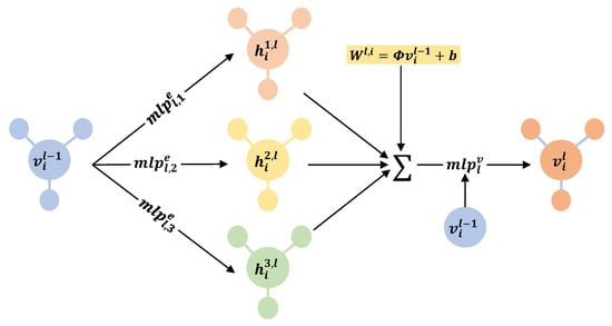 Here denotes all neighbors of node i. Inspired by the work of Transformers and Corso et al. [42], we add H heads and combine multiple aggregators ( denotes a set of different aggregators such as mean, sum, min, or max). We apply different weighting coefficients to each header and aggregator and extend Equation (5) as