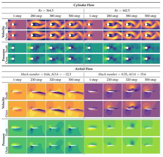 Qualitative results. We tested our model in two fluid systems, cylinder flow and airfoil flow. In Figure 4, we apply the proposed method to predict the velocity and pressure on the trajectories of the test set for the two systems and compare them with the ground truth (CFD). For cylindrical flow, our model can capture periodic and trending information from historical time series at different Reynolds numbers to accurately predict laminar flow and Karman vortex street behavior in trajectories. In the high-speed airfoil flow, our model can successfully learn the changing flow field at different Mach numbers and angles of attack, and accurately predict its flow separation phenomena as well as vortex-shedding behavior. In both systems, cylinder flow and airfoil flow, our model accurately captures the frequency and phase of vortex shedding and visually presents predictions that are largely consistent with the CFD reference. This long-term stable prediction demonstrates that our model can be applied to complex physical systems.