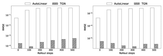 Illustration of averaged error over all state variables (Y-axis) of AutoLinear and TGN on cylinder flow (left) and airfoil flow (right). The RMSE of the TGN model is significantly lower than that of the AutoLinear model, which only considers temporal features.